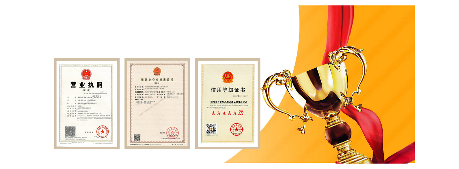 我公司先后受到遼寧省建筑業(yè)協(xié)會的好評,遼寧省及沈陽市工商局頒發(fā)的重合同守信譽企業(yè)稱號,勞動保障監(jiān)察書面誠信等級A,信用遼寧網(wǎng)站公示AAA等級,信用沈陽網(wǎng)站公示AAA等級,水利安全生產(chǎn)標準化二級單位,中國水利工程協(xié)會信用AAA等級,